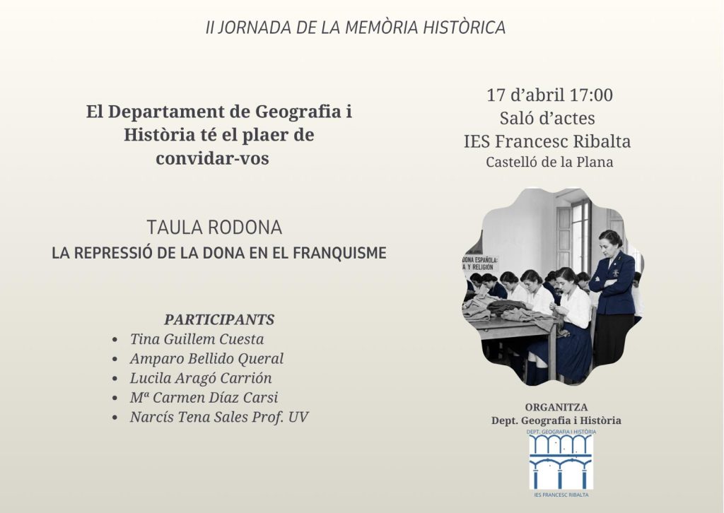 El 17 d’abril a les 17h el saló d’actes de l’IES Francesc Ribalta acollirà una taula rodona sobre la repressió de la dona en el franquisme amb la participació de Tina Guillén, Lucila Aragó, Ma. Carmen Díaz i Amparo Bellido, membre del GRMHC.
